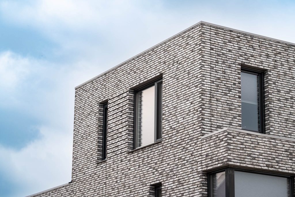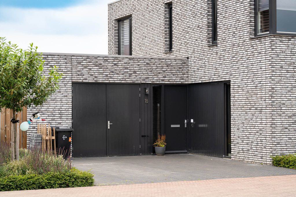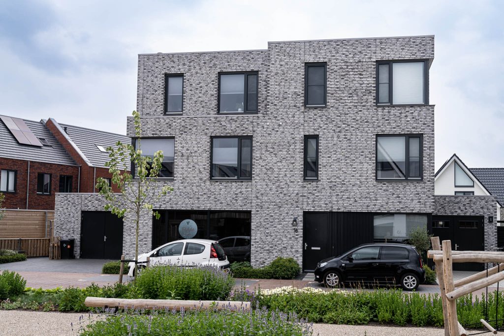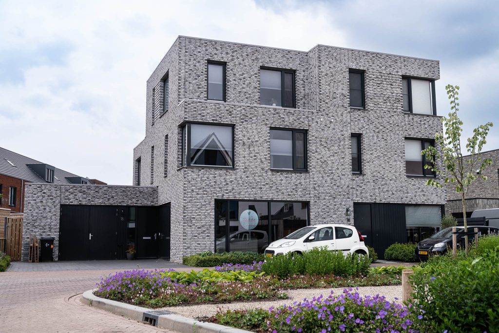 Strakke lijnen, blokvormen, stoere grote raampartijen en een modern gekozen lichtgrijs-antracieten steenmelange. Dat zijn de ingrediënten van deze aan de Nol van Hattumhof gebouwde 2-onder-1-kapper. Geen raam is hetzelfde, beide woningen hebben ieder hun eigen karakter binnen 1 geheel. Knap gedaan van de architect.